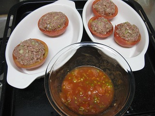 くり抜いた後の、トマトの器にミンチ詰めて