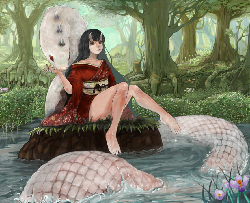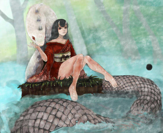 鬼の姫 → ヘビ(頭) → ヘビ(胴体部分) → 水 →背景の木