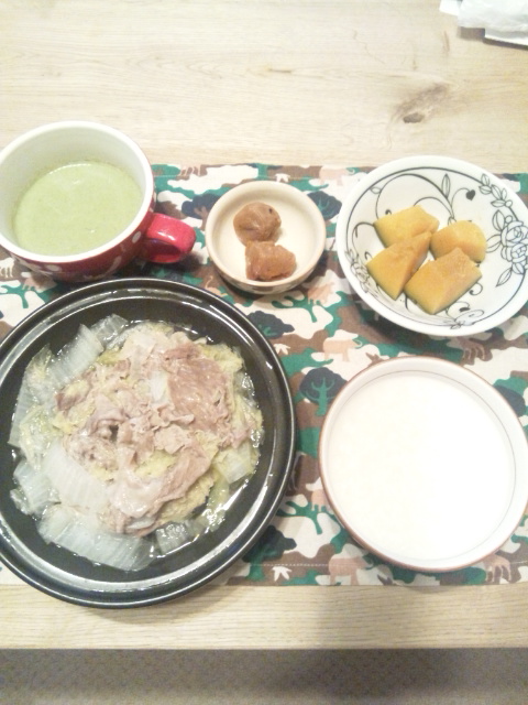 野菜のポタージュは、いつもはバターとか生クリームとか入ってるんだけど全部なしで、水と豆乳とコンソメで。